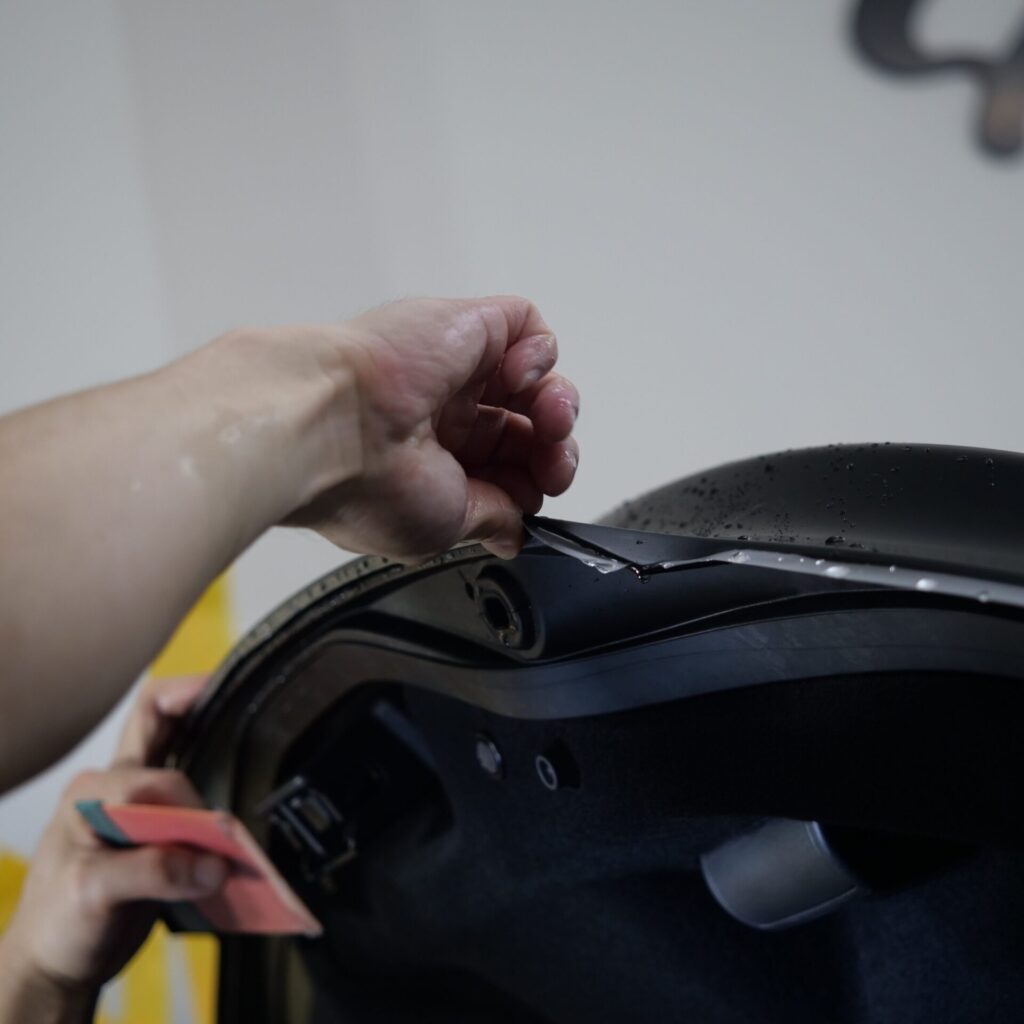 一方で、メッキやブラックパーツはグロスPPFを使用することで、