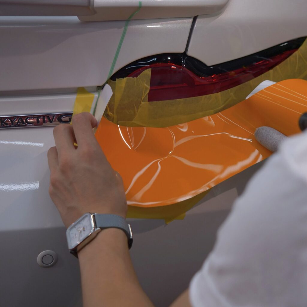 サイドラインにオレンジを入れることで、車全体のスタイルを引き締め、軽快な印象をプラス。 - テールランプまわり:オレンジラッピング施工