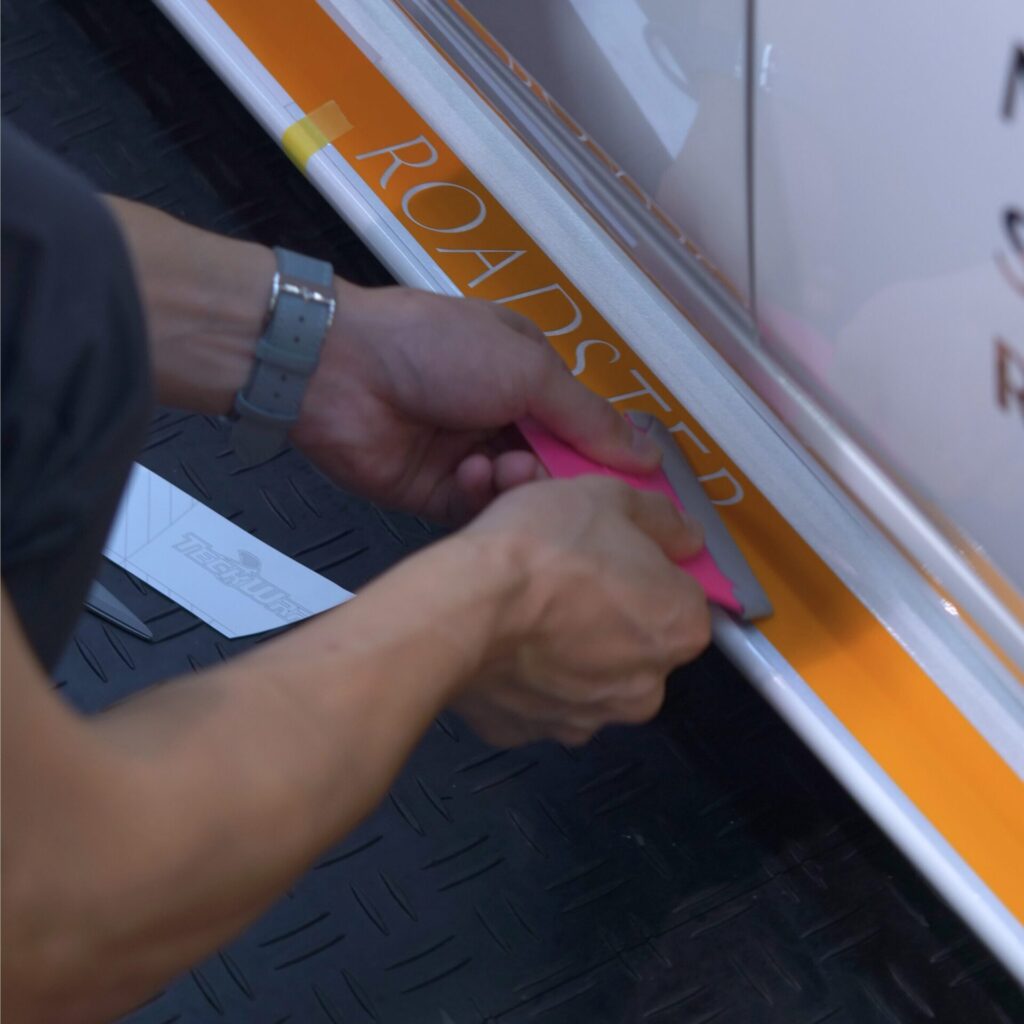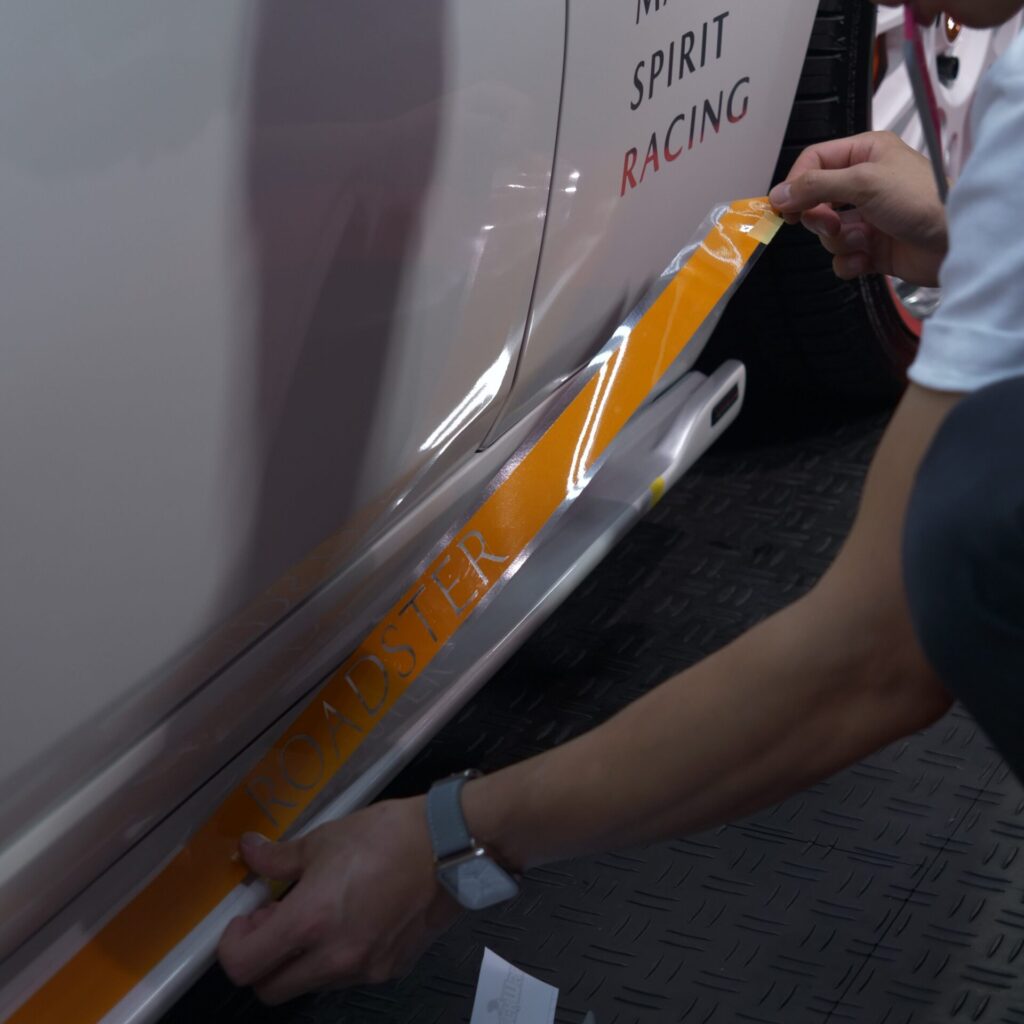 サイドスカートには「ROADSTER」とデザインしたラインを施工しました。