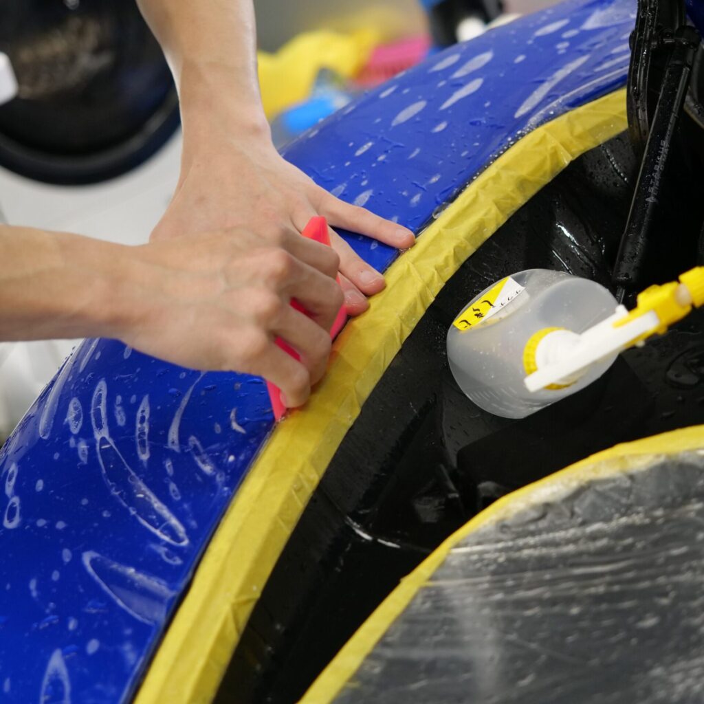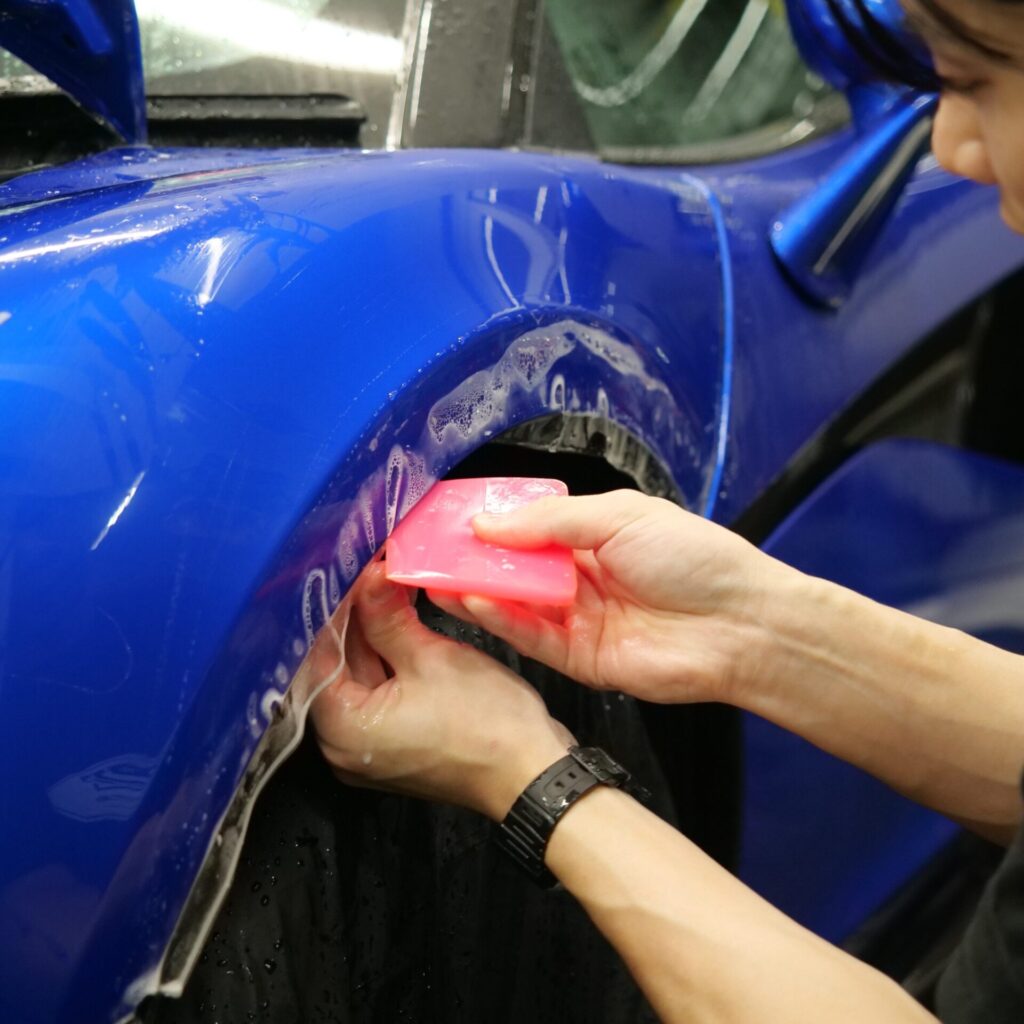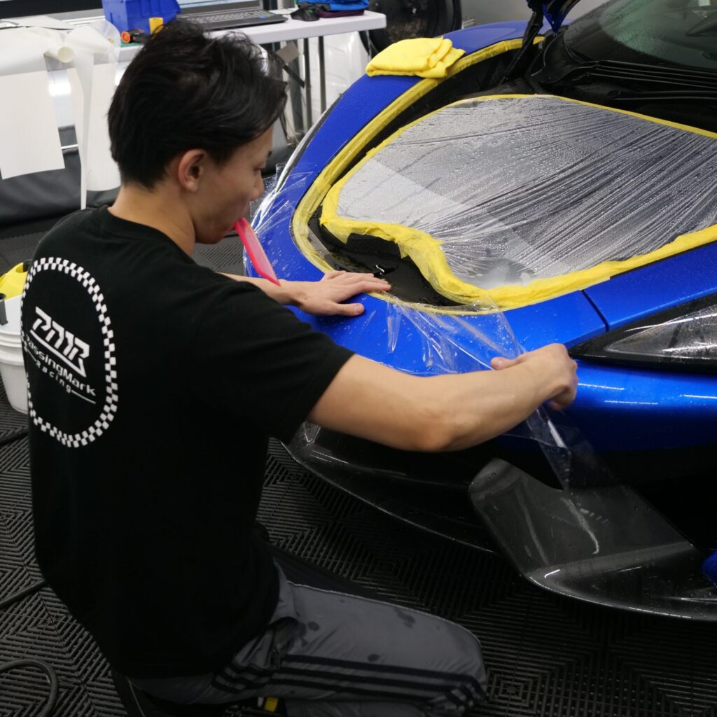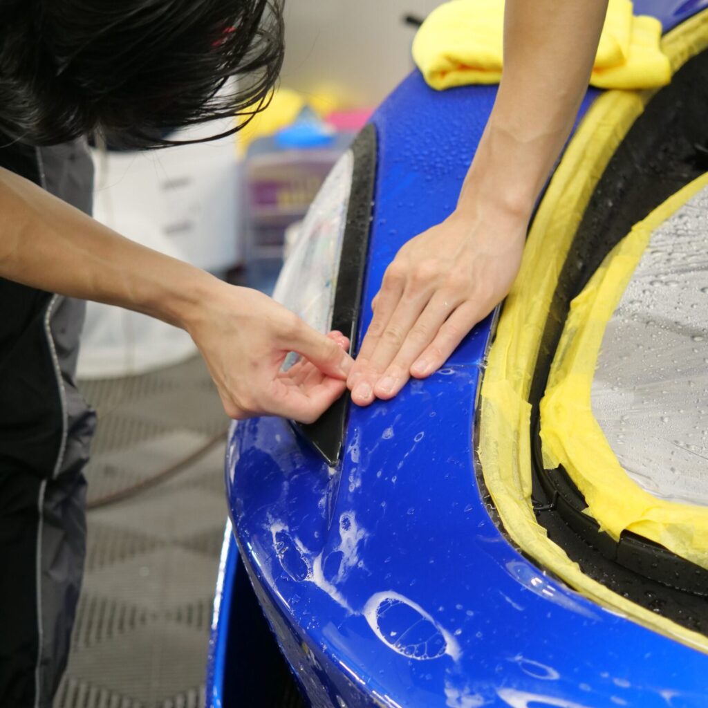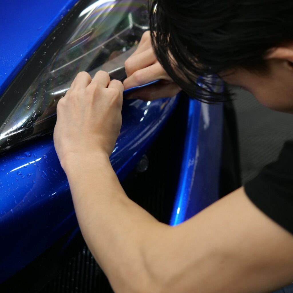 ボンネットからフェンダー、バンパーまで自然につながるよう丁寧に貼り込み。
