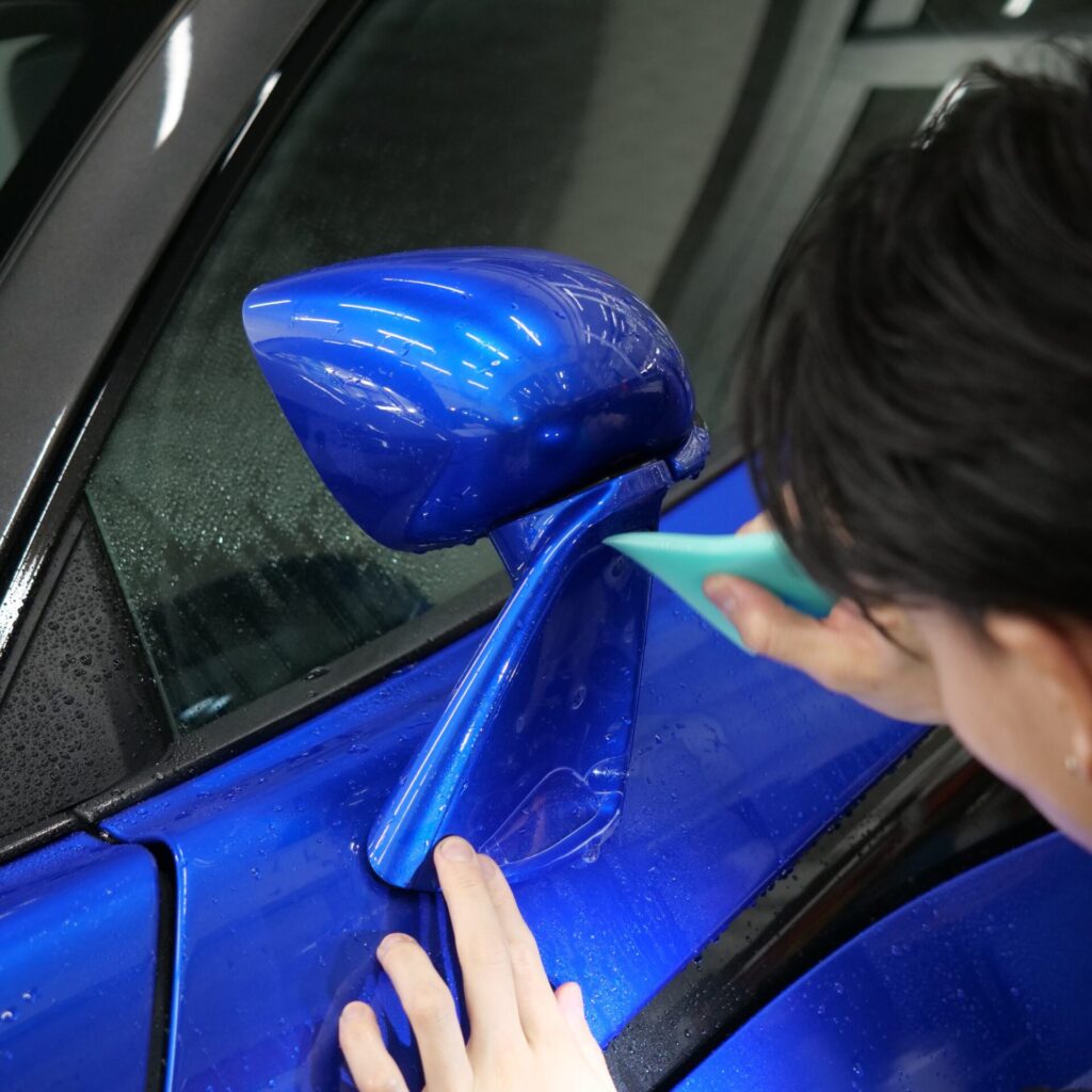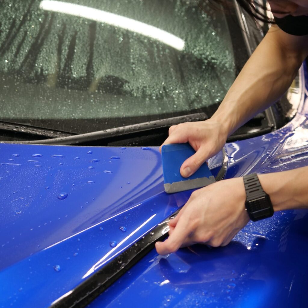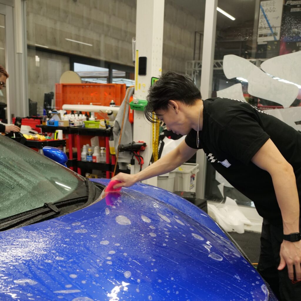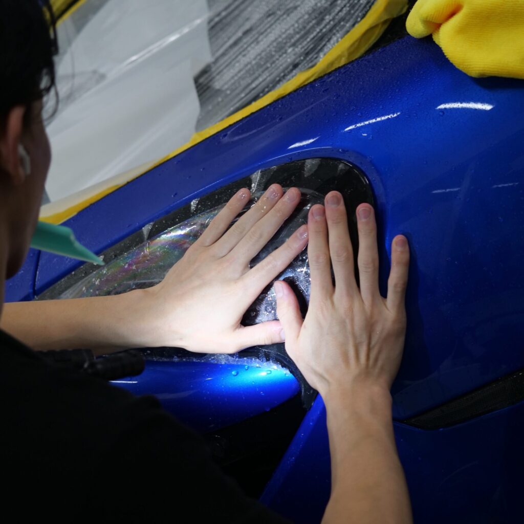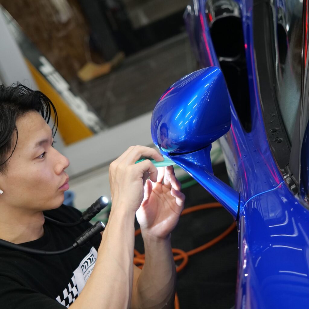 ボンネットからフェンダー、バンパーまで自然につながるよう丁寧に貼り込み。