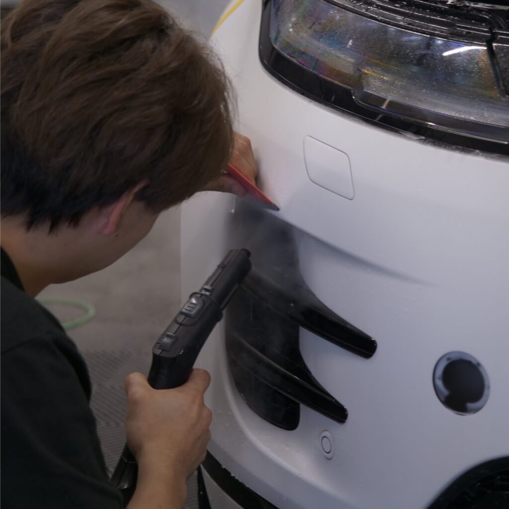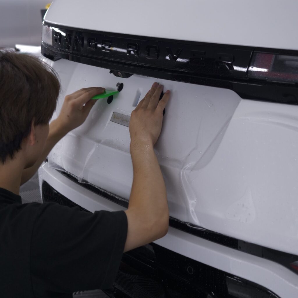 イヴォークのような曲面が多いボディでは、シワや気泡が入らず、端部をきれいに処理するには熟練の技が不可欠です。